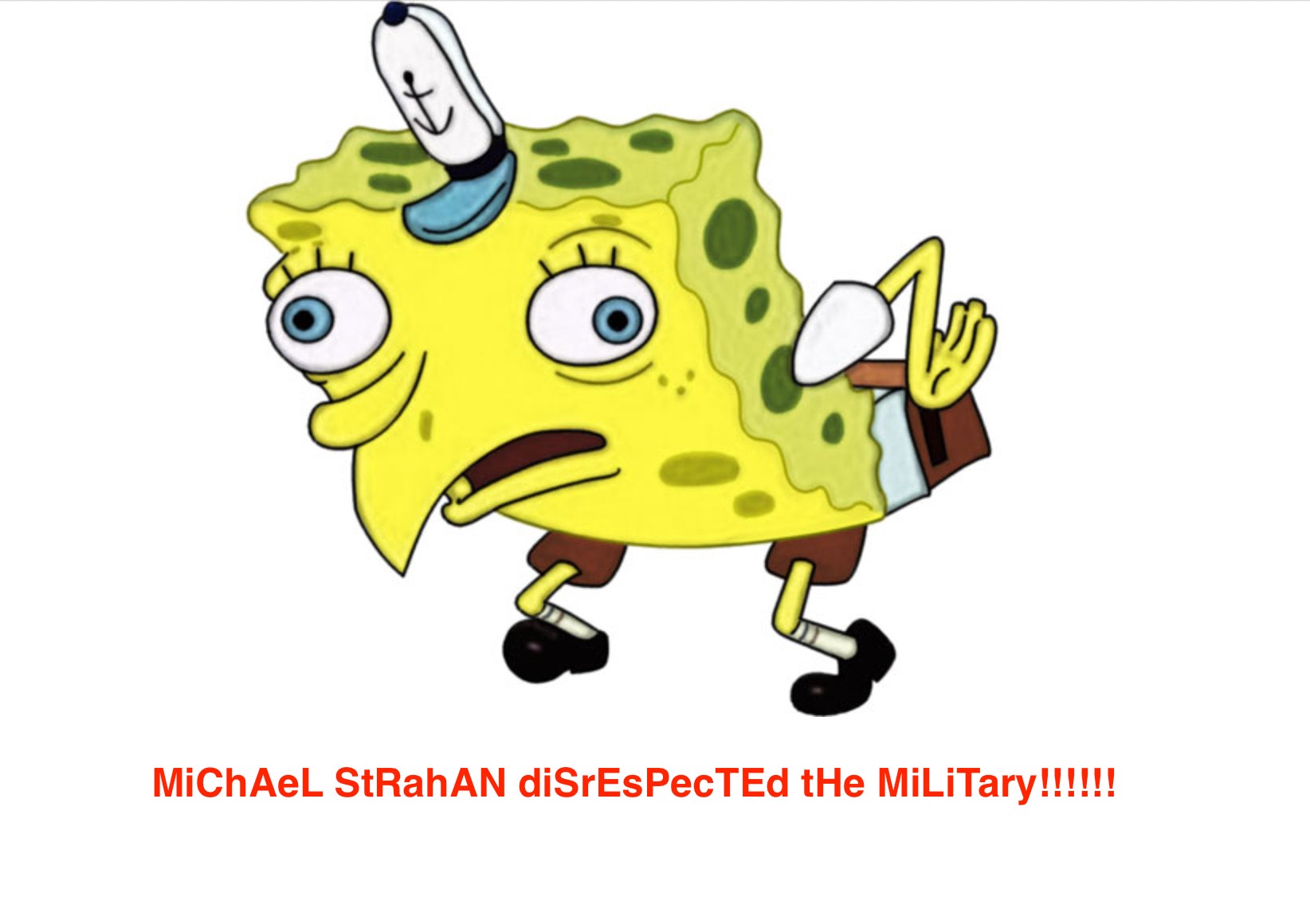 And in this particular case I'm especially confused at the manufactured oUTrAgE because 1) Strahan is standing very respectfully anyways and 2) he's the son of a veteran who served for 23 years, grew up overseas as a military brat, and he's done so many good things for service members & vets. We worked with him a couple years ago for a Veterans Day initiative and he couldn't have been kinder & more personable.