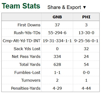 574 yards. Just imagine how that would work out on a drive by drive basis. It's like if two evenly teams matched up except one team was given five 99-yard drives as a handicap along with an additional 79-yard drive. This wasn't against your everyday bum looking for something to do between his coal mining job either. This was Sonny Jurgenson that got plastered by the Bart Starr Packers.