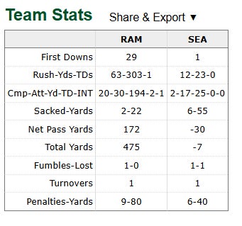 PFR should have dug the knife in a little and labeled the first row "First Down(s)". Net passing yards certainly could have improved here. Jim Zorn went 2/15 passing for the Seahawks for 25 positive yards, but was killed by 55 yards worth of sacks. The Seahawks would at least go on to end the season 9-7. No playoffs, but a respectable season.
