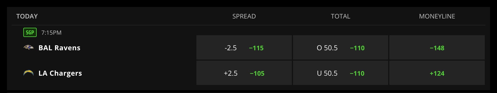 Tonight on Monday Night Football, we've got the 7-4 Baltimore Ravens visiting the 7-3 LA Chargers +2.5 (50.5)