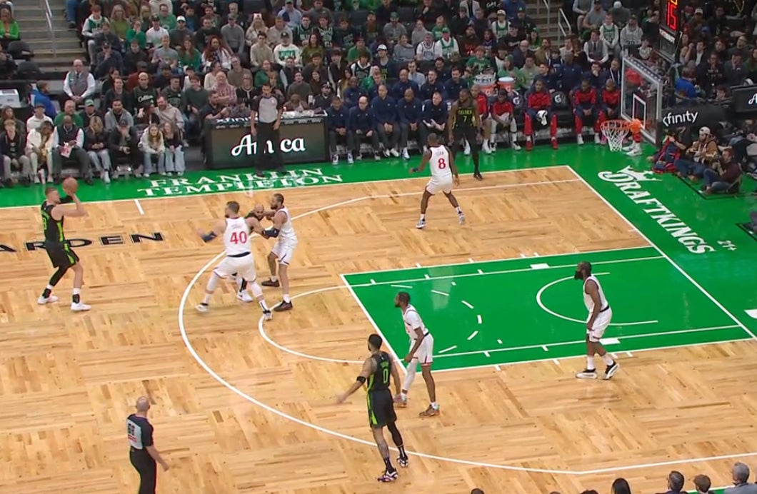 Offensively, it didn't take long to see the impact of why KP raises this team's ceiling to unknown heights. It's a simple lose/lose situation. You're presented with a choice, you can either send two to Tatum/Brown off a ball screen and give an incredible shooter this type of space