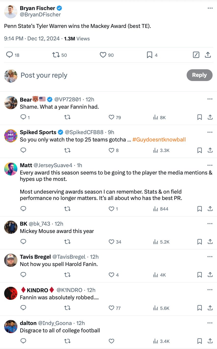 But I do take solace in the fact that a majority of the tweets from non-Penn State or B1G accounts announcing Tyler Warren as the Mackey winner go something like this.