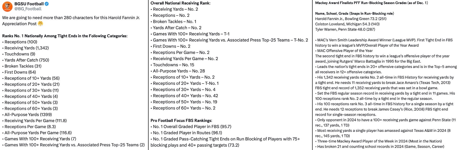 Penn State fans will say Tyler Warren did it against better competition, despite Harold Fannin Jr. putting up 137 yds, 1 TD at Penn State & 145 yds & 1 TD at Texas A&M while playing for a MAC school, and Tyler Warren not once going for 100 yards vs a ranked opponent. I don't even fully buy that Tyler Warren played football at a higher level of difficulty than Fannin this year. I'm sure Warren had on average tougher individual matchups. But with the exception of 2 games, Penn State's B1G schedule wasn't tough. On average there was a bigger talent disparity between Penn State and the teams they played than what Bowling Green had. Tyler Warren had a 5-star QB throwing to him all year long. Harold Fannin's schedule was weaker overall, but there are also benefits Tyler Warren had playing for Penn State that Fannin didn't.