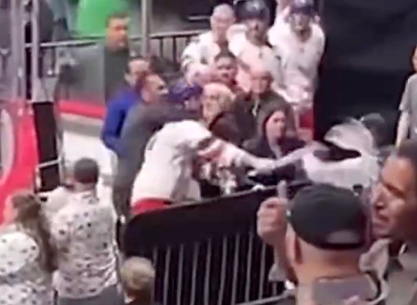 Some players who have a longer fuse might be able to brush it off. Some players will do everything in their power to just ignore it. Tyson Bell doesn't have any fuse. He only has a detonate button. And these fans apparently did enough to press that button. So with zero hesitation, Tyson Bell immediately goes over to them and starts to unload. Takes off the glove, throws a quick punch to let them know that it's on. Then when the fans get out of his reach, the good news for him is that he has a 4' long lacrosse stick he can still be in range with.