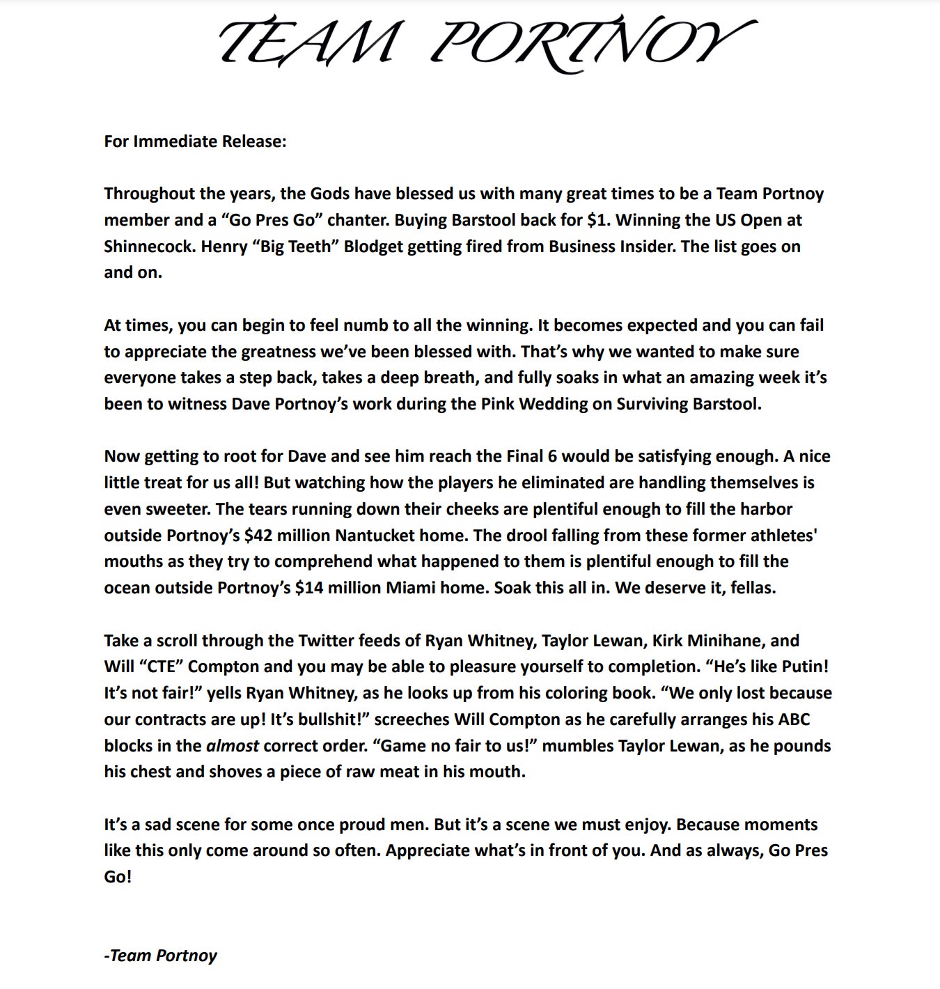For Immediate Release: Team Portnoy's Statement On This Week Of Surviving Barstool