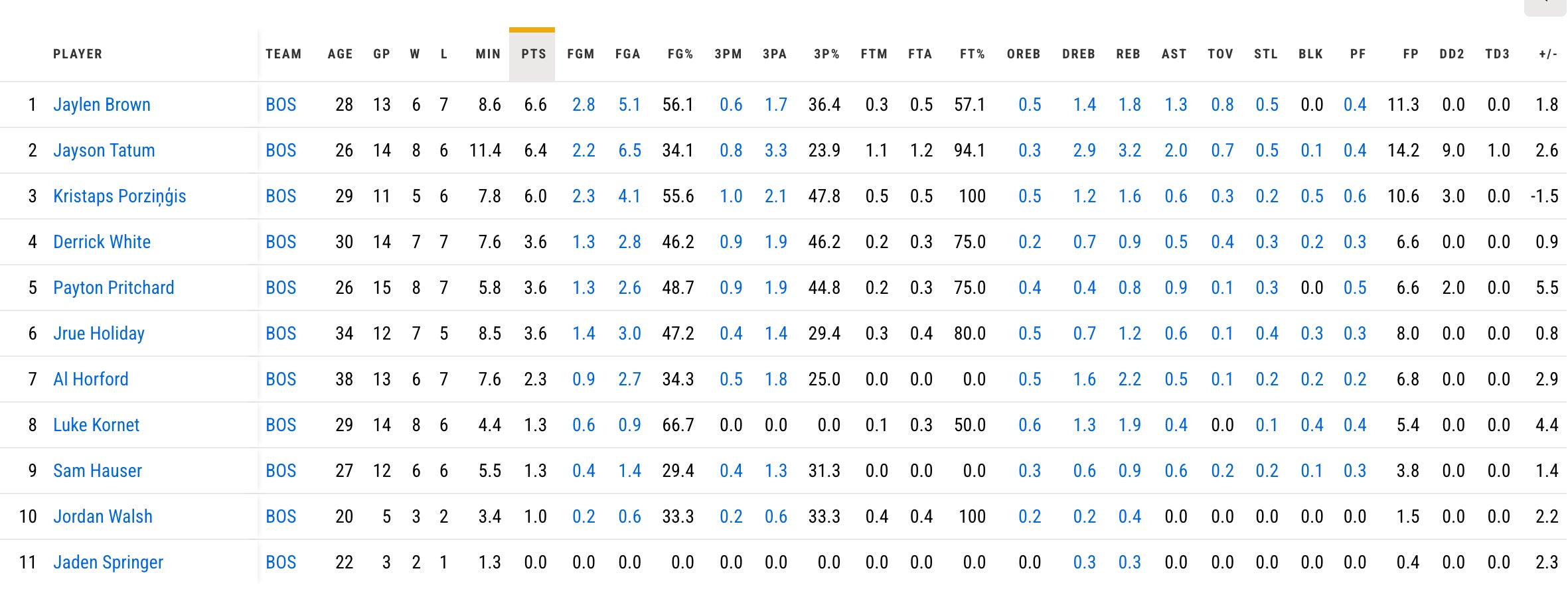 - Looks like we're back to another Sam Hauser shooting rut, Over his last 6 games he's shooting just 36/31%, including a 1-6 (1-5) last night. There was a 3 game stretch to end December where he looked like himself, but ever since we got into January he's back to being a complete brick.