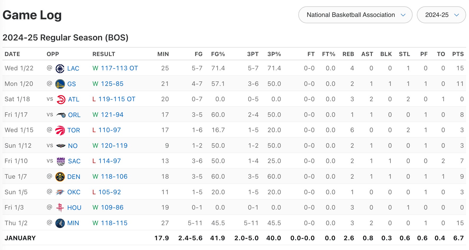 - I'm not declaring him officially "back", but I will say that since his 0-7 (0-5) performance in the loss to the Raptors, after last night's 5-7 (5-7) showing from Sam Hauser, he's not 8-15 from deep over his last two games (both wins). In fact, it's an interesting trend that when you look at how the Celts have played in 2025, in games we see Hauser made more than 1 3PM pretty much always leads to wins.