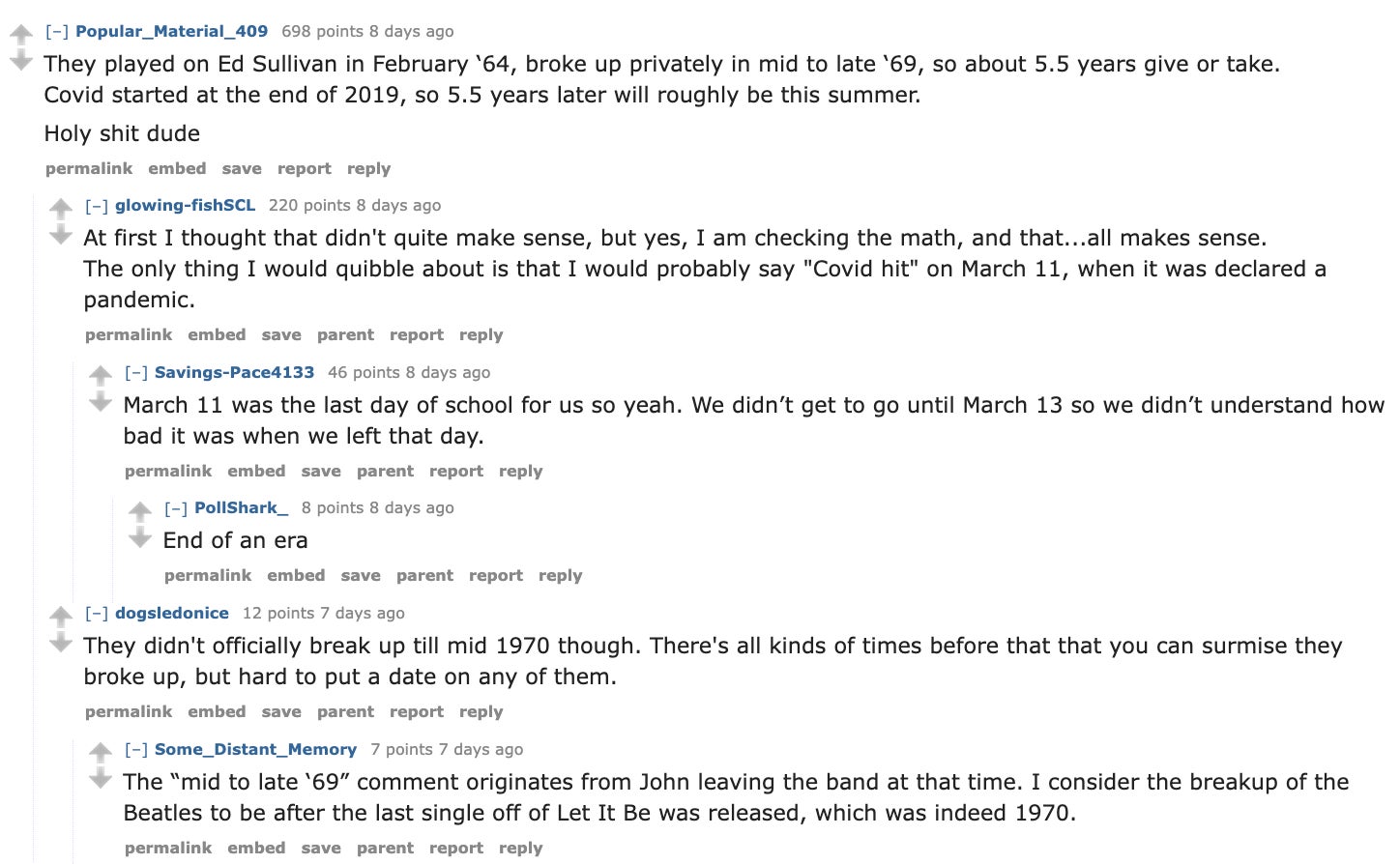 Here's a fun fact that truly blew my mind when it came across my timeline this weekend: if The Beatles had played The Ed Sullivan Show when COVID first started, they'd be breaking up later this year.