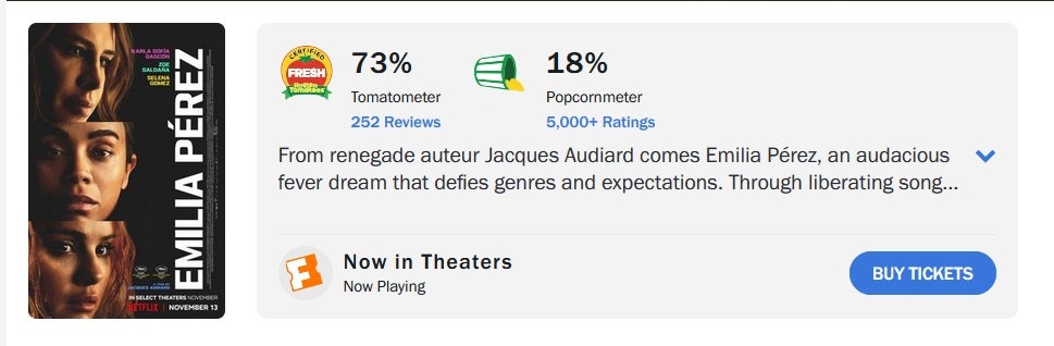 Besides, Emilia Pérez has the unmistakable feel of one of those seminal, culture-altering moments.  A movie made by a French director, ostensibly to celebrate Mexican culture, that reportedly includes all the worst Mexican stereotypes, with the title character played by someone from Spain and a grand total of one actual Mexican actress, would be appointment viewing anyway. But add to the fact the Academy was mesmerized by it, critics were mildly approving, while audiences detest this thing  with the heat of a million black leather car seats: