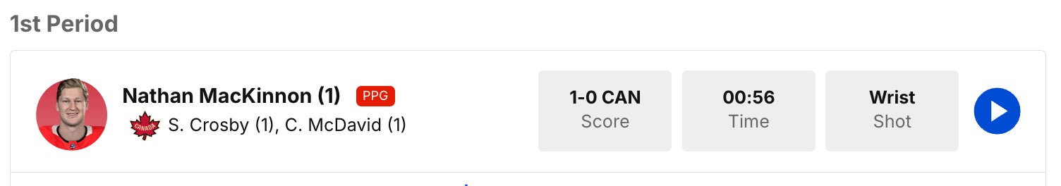 Nathan MacKinnon. Stanley Cup Champion. Hart Trophy winner. 1st goal of the 4 Nations Faceoff.