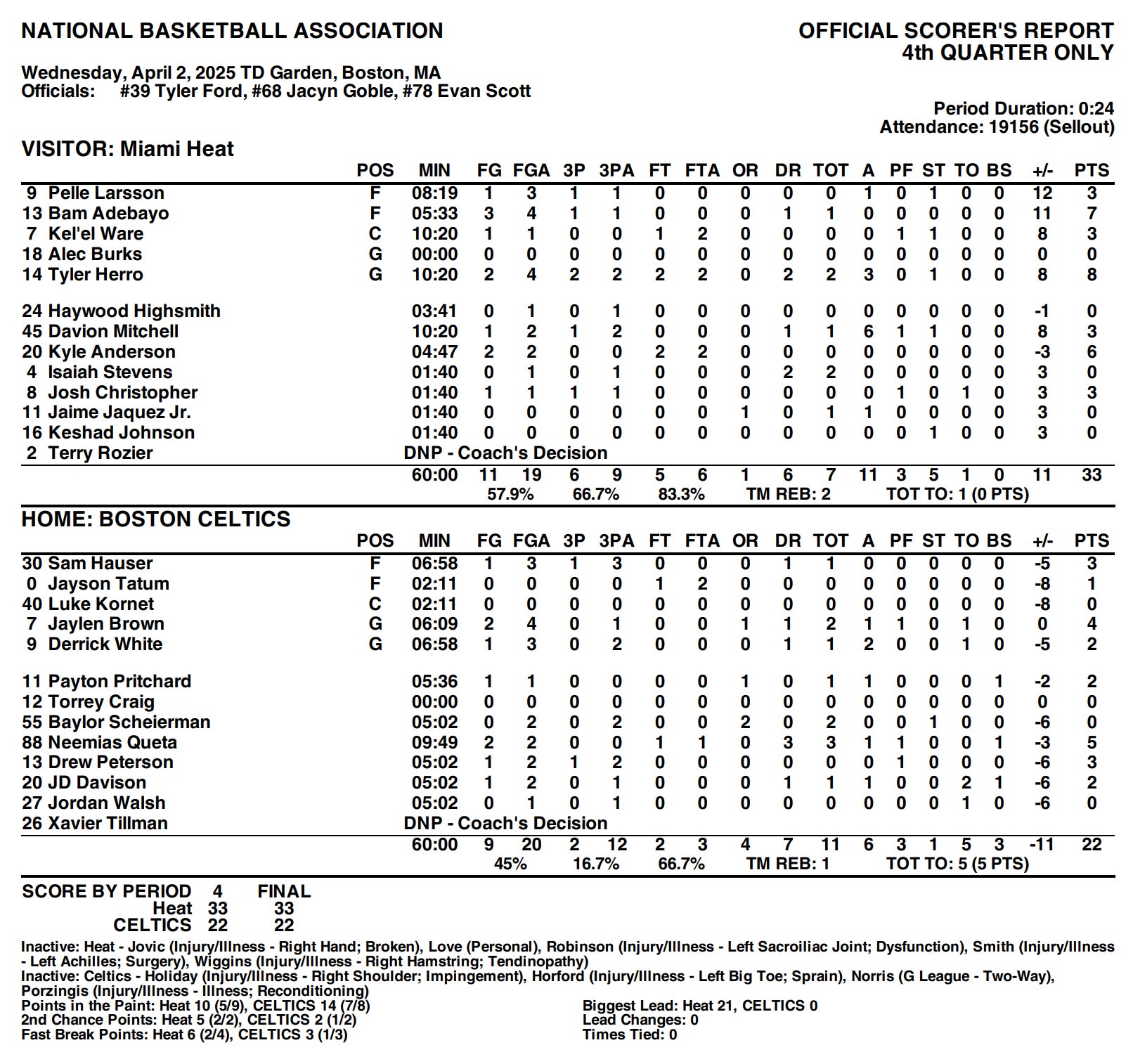 In no world should the Celts be giving up 29, 30, 32, and 33 point quarters to this Heat offense. I don't care if they're rolling right now, that type of defensive execution, at home, is inexcusable. Just compare it to every other game against MIA this season
