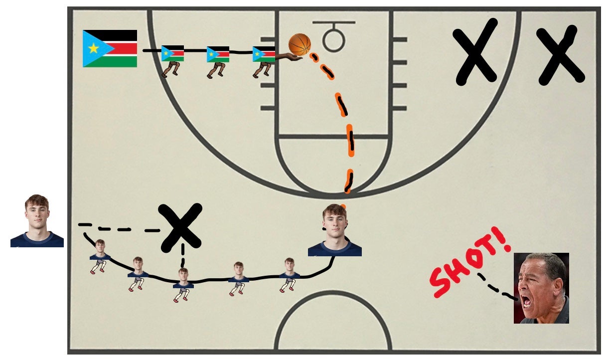 I do not say this in jest. If I took over coaching duties for the Duke Blue Devils last night with 17 seconds left in the game, Duke would be playing for a National Championship tomorrow night. I don't know any fancy basketball play lingo (aside from the acronym BLOB). But before that possession, I'd have simply told the team. "Hey guys. Coach Scheyer had a family emergency. Cooper Flag you're inbounding the ball. Give it to whoever, it doesn't matter. They're giving it right back to you. Everybody clear out. Take it one-on-one from the the top of the arch. Size up the defender. He'll think you're going to drive. But pull the trigger from deep with 6 seconds left. Miss it a foot or two to the left. Where's the tall gentleman from South Sudan? As-salam 'alaykom. You start in the corner. When he shoots, go catch it and score. Blue Devils on three."
