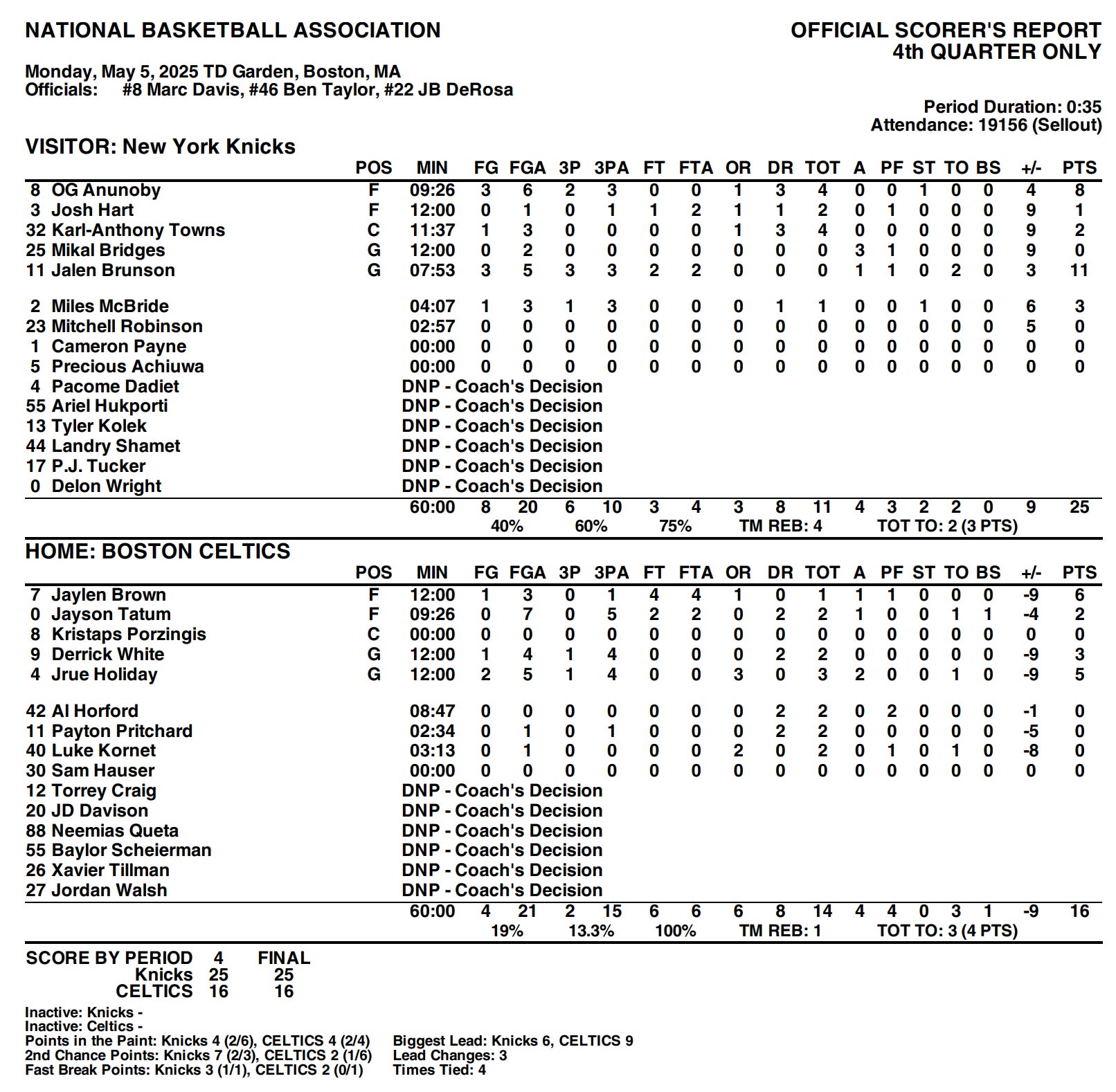 Jayson Tatum went 0-7 (0-5) in the 4th quarter. He entered the game with the Celts up 4 with about 9 minutes to go and had one of his worst closing performances of the season. Way too much settling (by his own admission), and way too many possessions where he had a mismatch on the perimeter and then bailed the Knicks out by not making them pay for switching.