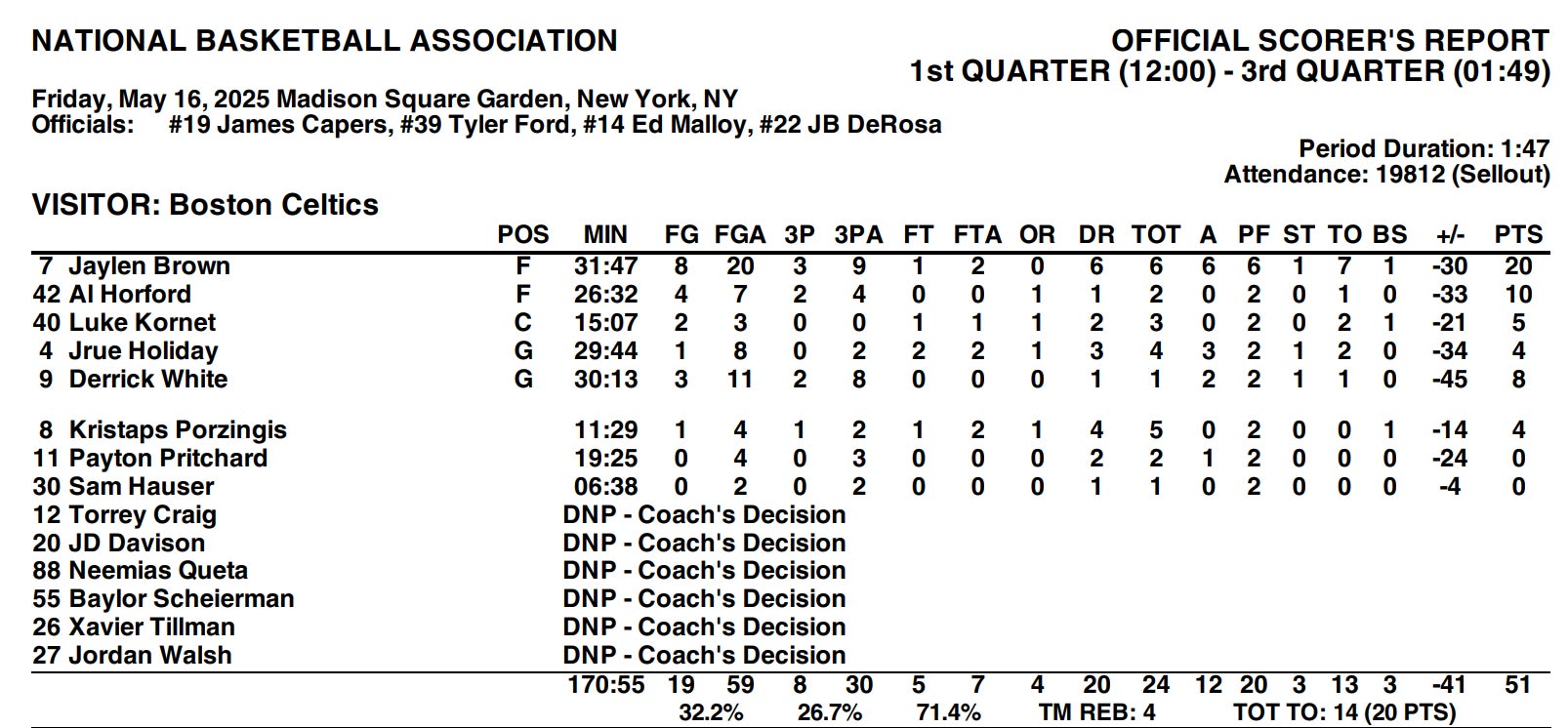 Just a complete and utter no show in the biggest game of the season. So frustrating, so deflating. It's not even just about not having Jayson Tatum. They didn't have him in Game 5 either, and their performance was nothing like what we saw in Game 6. This time around, they were completely outplayed in every aspect of basketball. I mean hell, Jaylen Brown fouled out in 3 quarters for crying out loud. This is what things looked like before Joe pulled everyone with 2 minutes to go in the 3rd quarter.
