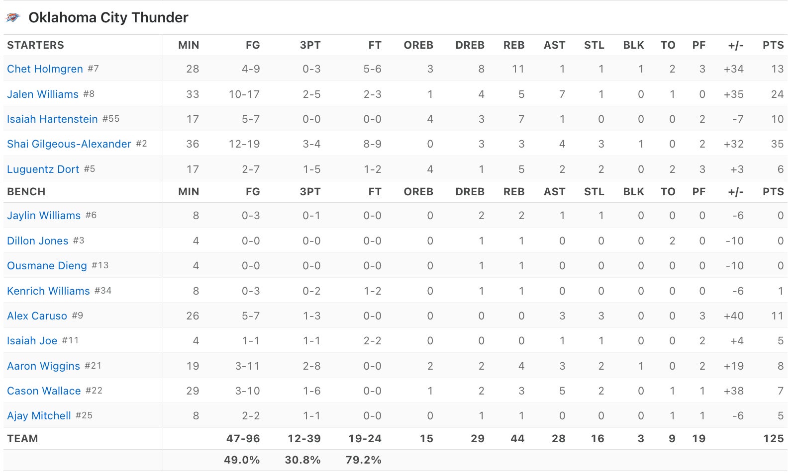 Well, that wasn't exactly the competitive Game 7 thriller I think most of us were hoping for. Things were close for about 1.5 quarters, but once the Thunder closed the first half on a 14-2 run to go up 14 points and then started the 3rd quarter with a 9-0 run, that was pretty much it. The way they can hit you like an avalanche is crazy to watch in real time, because all it takes is 3 or 4 possessions and boom, you're dead.