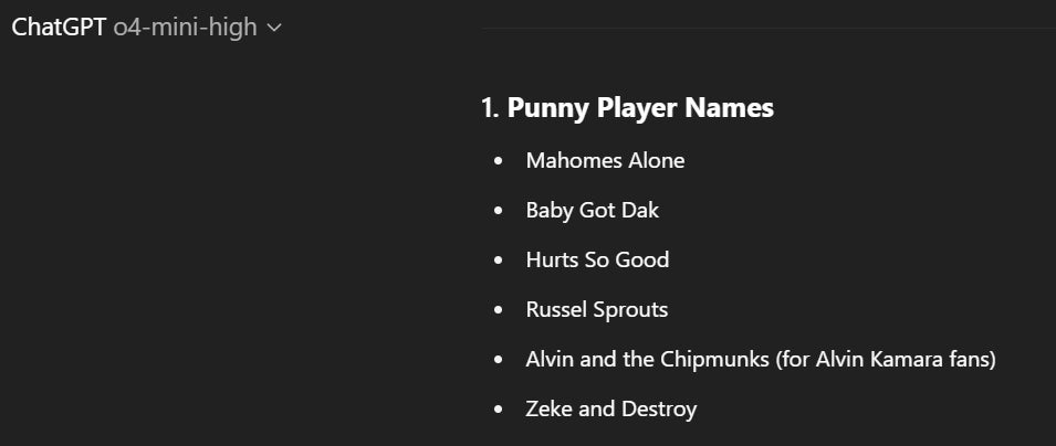 Anyway, here we go. I came up with all of these myself by running code to get every NFL player's name to see what we have to work with. Some of these are bad. Some are less bad. And a lot are probably more bad. But hopefully they aren't ChatGPT bad. Let's get to it.