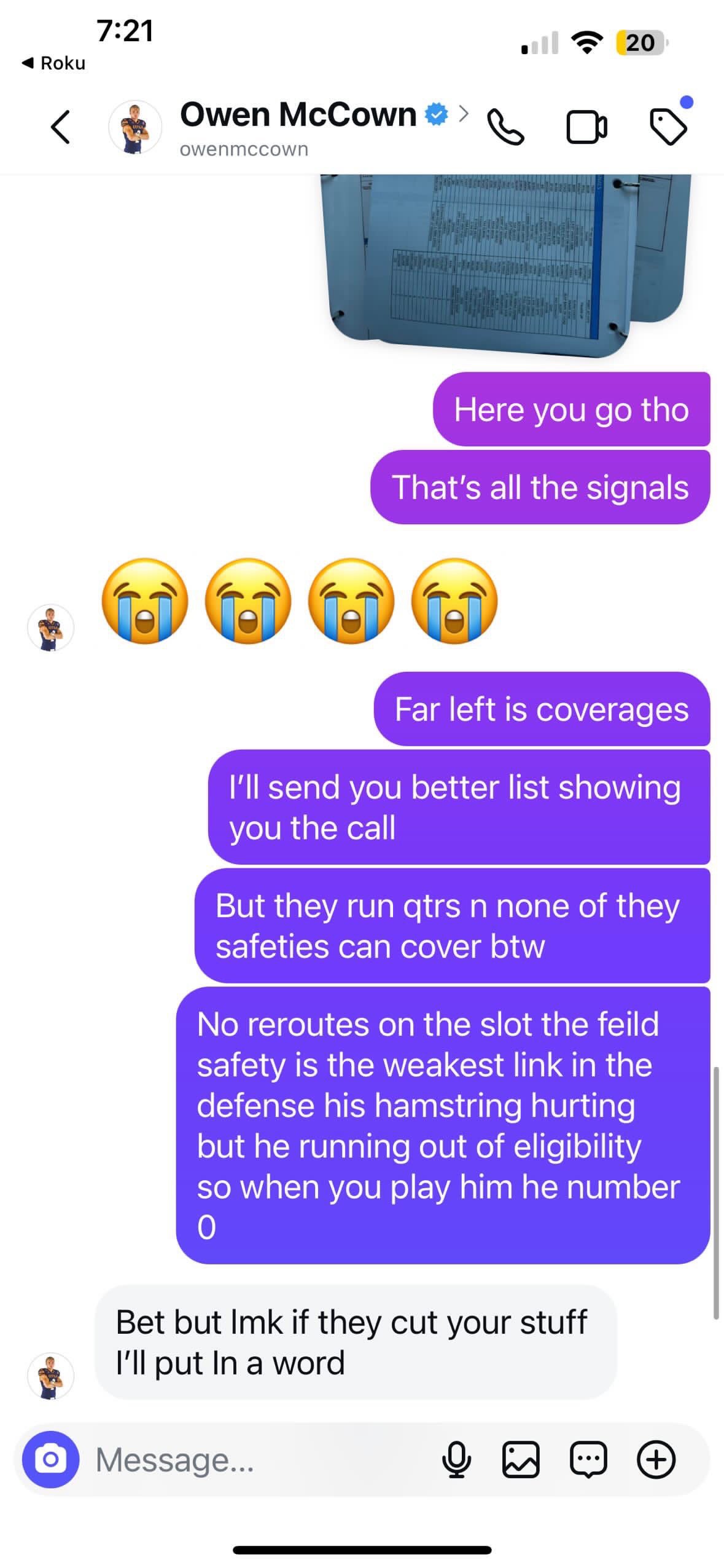 Sign-stealing has been a hot button issue in college football the last few years, but this is the first I've seen of a team having an opponent's signals because a player on the other team simply DM'd it to the opposing quarterback on Instagram. Sometimes it's better to be lucky than good.