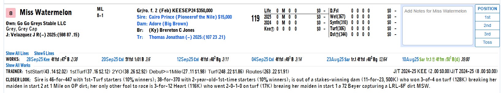 The daughter of Cairo Prince will be going long (a mile and a 16th) on the Keeneland turf (grass). The dam won three of four starts on the turf, and Miss Watermelon has a sibling who tried the turf but was a winner on synthetic. Trainer Jonathan Thomas is not known to win with 2-year-olds debuting on the turf (5% over the last five years). Sire Cairo Prince has had some solid turf runners, including the talented My Boy Prince.