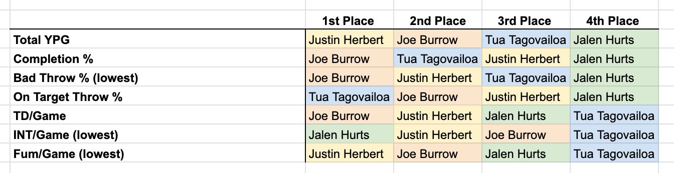 Again, Herbert and Burrow are getting shafted while the Hurts and, to a lesser degree, Tua, have coasted.
