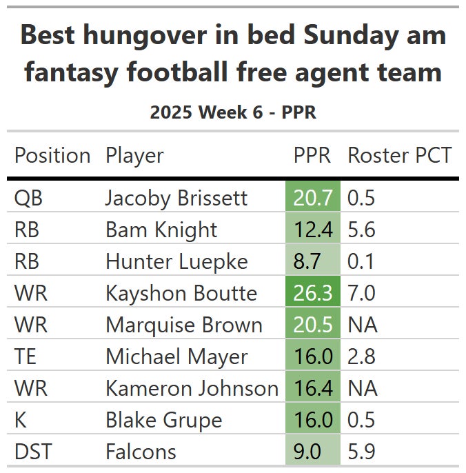 Calvin Ridley also might have helped had he not did Calvin Ridley things like get hurt. Here's your saddest realistic team possible. How many did you have? 29.9 PPR points.
