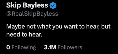 I'm not one to Tweet number shame because I only go down in followers on the X platform and nobody pays attention to my Tweets anyway, but 3.1 million followers for 129 likes…that's what I'm talking about! That's Barstool Nate ass numbers right there. Brought a big ol' smile to my face when I saw that nobody gives a fuck about anything Skip Bayless says. Same here, brother. Same here.