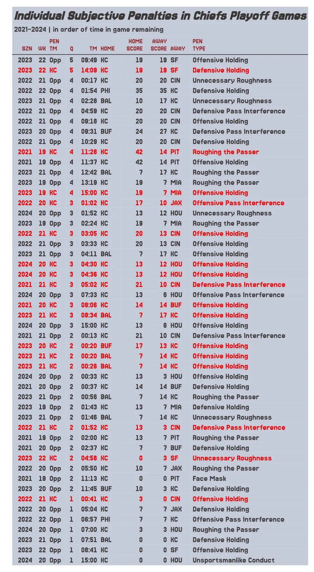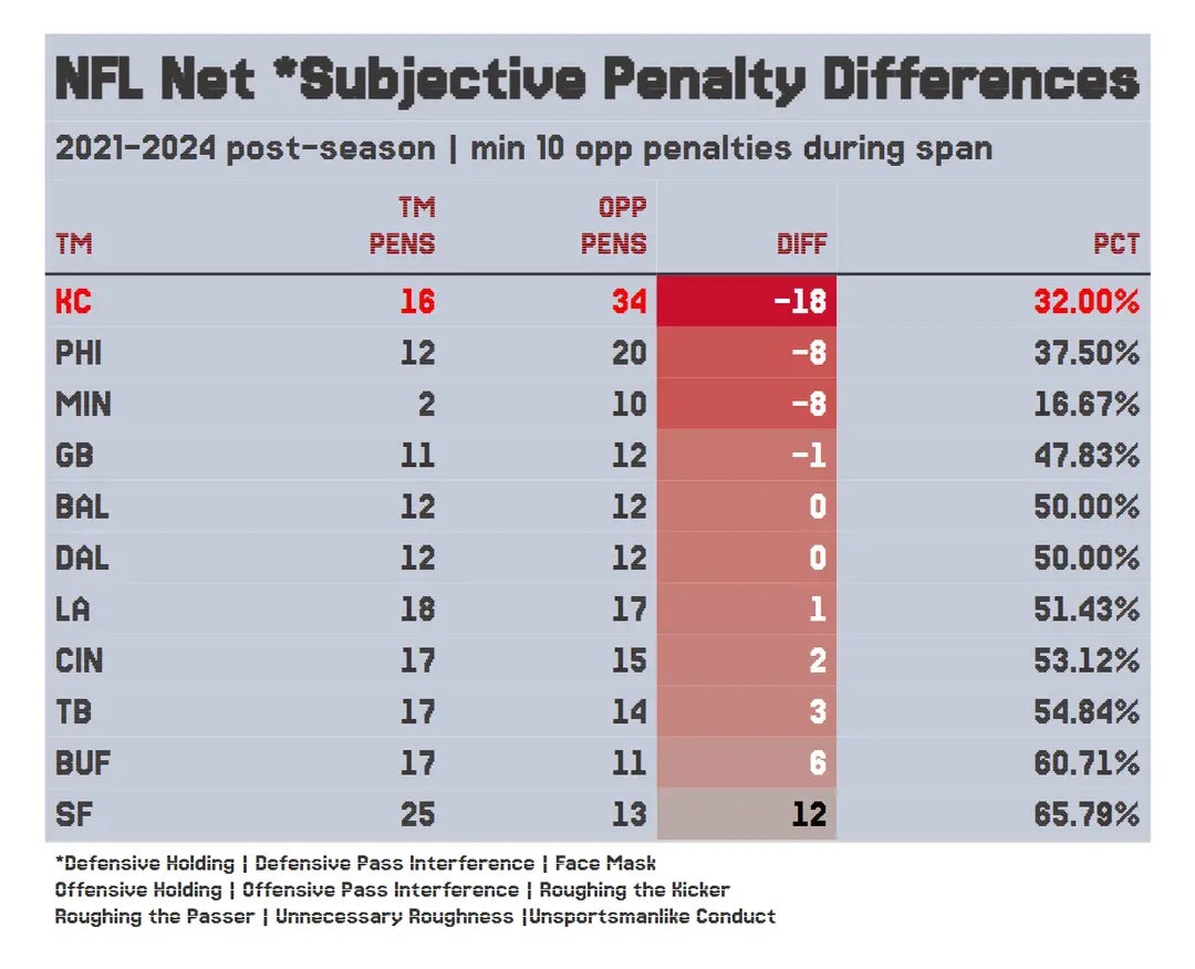 Quick TL;DR for my blog above on all this. I looked just at 2021-2024 which isolates to Mahomes' playing years (even his rookie year in which he didn't play in the Playoffs although I could probably have just removed that). If you just consider subjective penalties, the Chiefs had the largest difference vs their Playoff opponents.