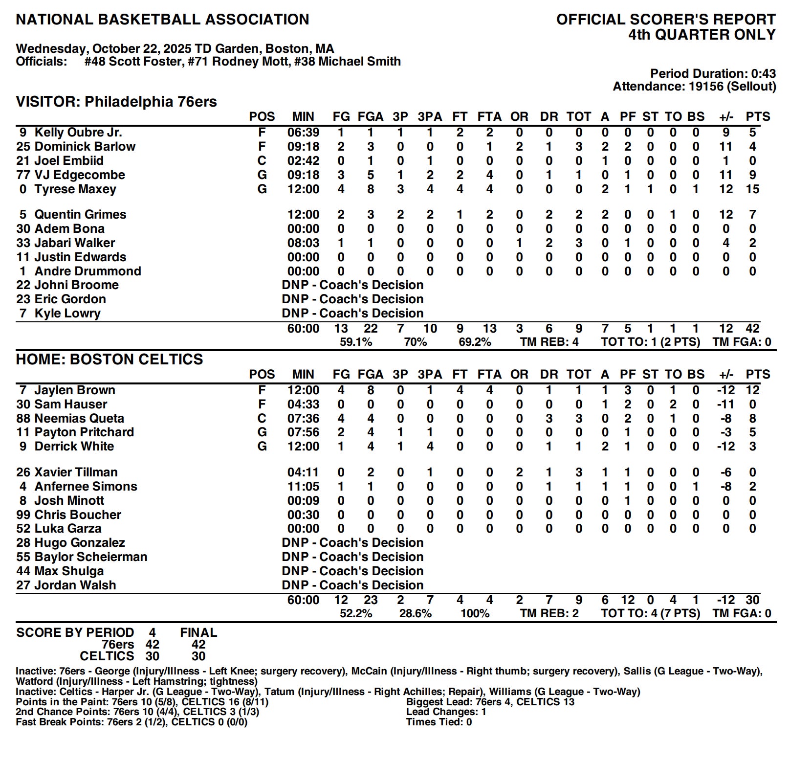 Take the OREB/2nd chance points issue. For the game, the Sixers snagged 10 OREB, which led to 21 2nd chance points. The issue was that 3 of those OREBs and 10 of those 2nd chance points came in the 4th quarter. The very thing we all knew would be an issue for this team (defensive rebounding) ended up costing them a game right out of the jump. So while the Celts may have won the overall rebounding battle 42-40, when it came time to win and secure clean defensive possessions, they failed. It didn't matter if they went double big, or just had Queta on the floor, their inability to rebound and prevent 2nd chance points was a major factor in this loss and you saw how and why this is going to be a problem all year.