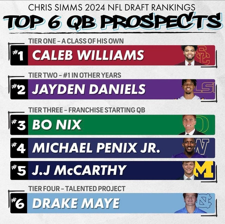 When he came out of North Carolina, he had his fair share of detractors. Not the least of whom was the perennially wrong Chris Simms. Sure, he's singing Maye's praises now. But in the predraft process, he had the 21-year-old somewhere in the "Also Receiving Votes" category: