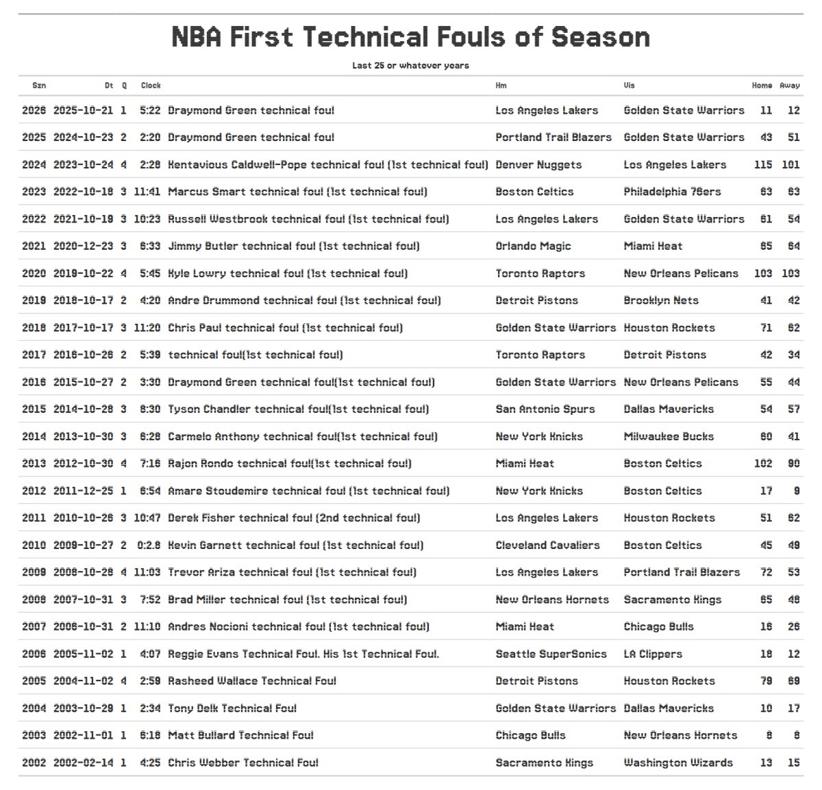 5:22 left in the first quarter of the first game was all he lasted this year. You better believe I ran the numbers across the entire play-by-play available era to see who was the first to crack each year. Shout out Draymond for at least lasting deep into the second quarter last season for the league's first tech.
