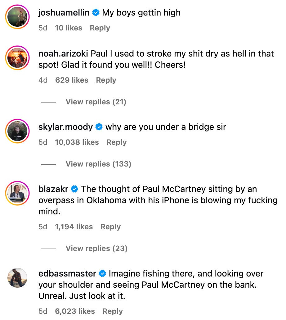 Either way, it’s kind of awesome. A Beatle sitting under a bridge in Tulsa, pondering the universe, maybe humming a tune, maybe lighting something up. If nirvana/enlightenment has a location, it might just be that patch of grass under an Oklahoma bridge with Sir Paul smiling at the clouds. It's brought on some great comments as well....