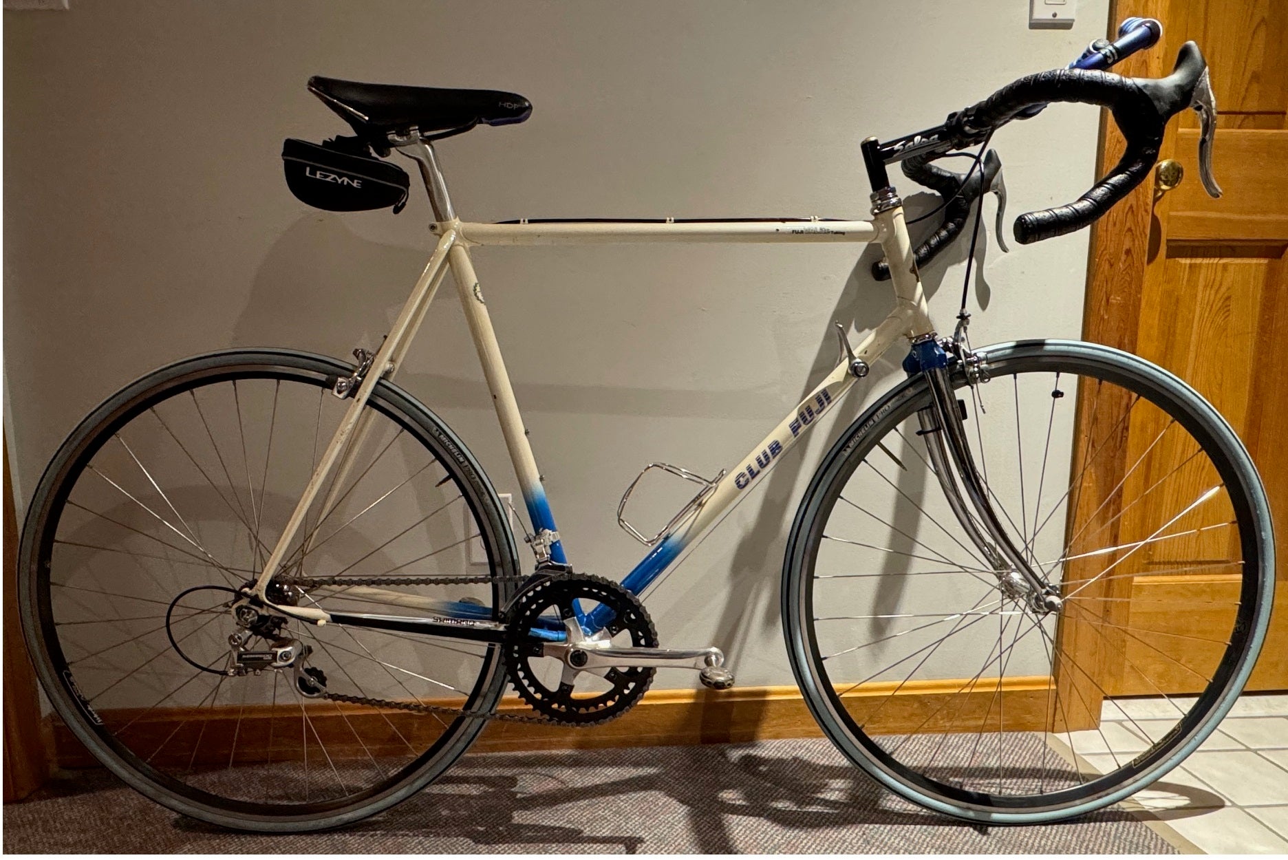 When the tires on my '86 Club Fuji wore out, I installed Mark's tires. I was still racing on the Schwinn and training on the Fuji, so the Fuji was my "beater".
