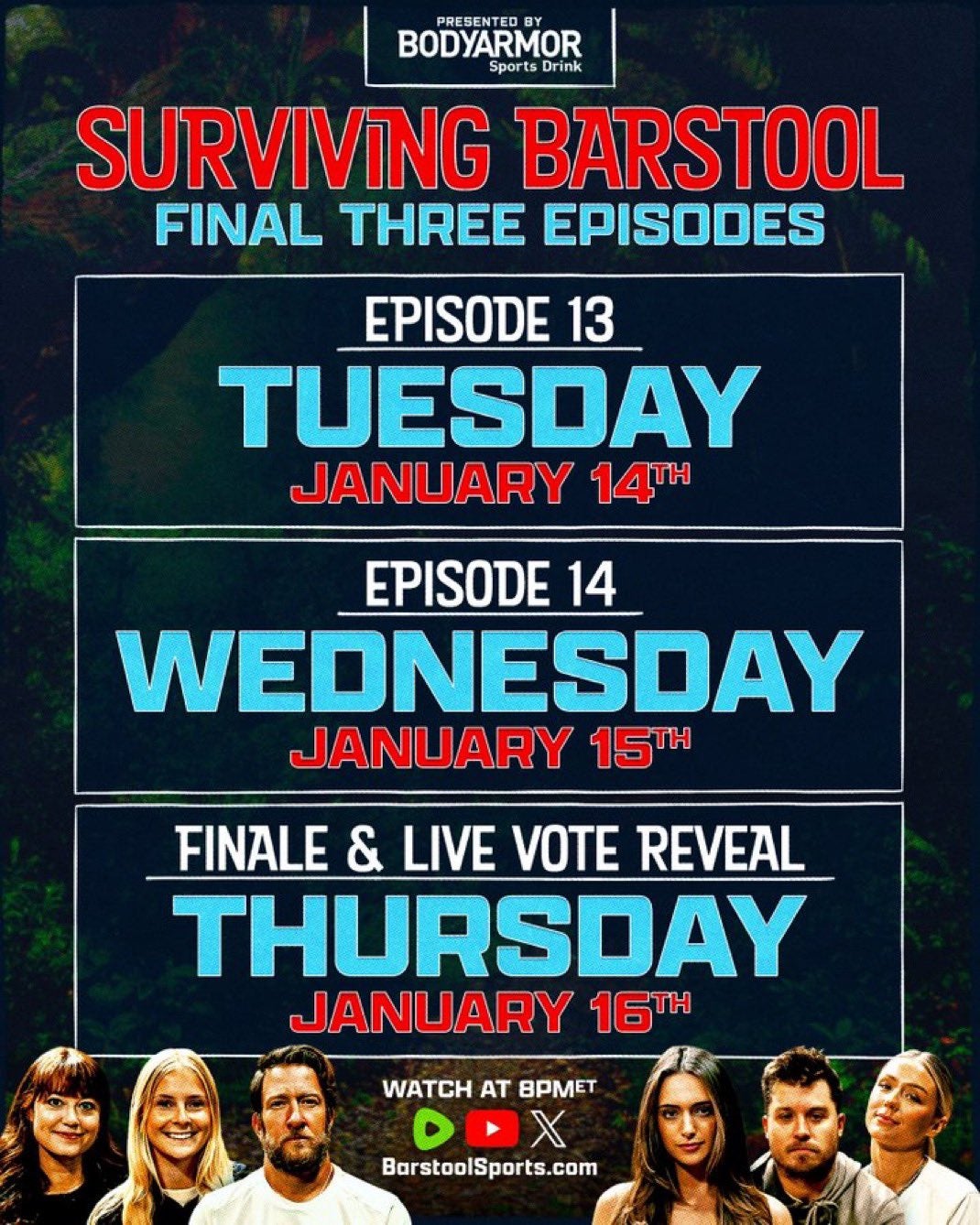The final week of Surviving Barstool has arrived. We have just three episodes left before a winner is crowned and $250,000 is awarded. Our final six consists of Dave, Kelly Keegs, Moobie, Ria, Rico, and Megan. Each has had their own unique journey to get here, but only one can be our ultimate champion. If you thought things were tense and emotional up until this point, just wait for tonight.